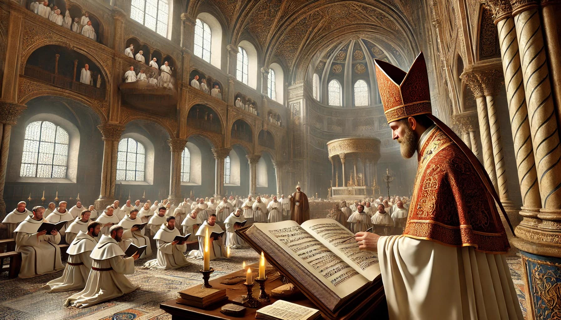 Eit sentralt namn i utviklinga av gregoriansk song er pave Gregor I, som styrte frå 590 til 604. Han arbeidde for å standardisere liturgien innanfor kyrkja, og som ein del av dette skapte han ei messebok. Denne boka setje fast songane som skulle syngast i gudstenestene. Pave Gregor oppretta også ein songskule i Roma, der alle kyrkjesongarar skulle få ei grundig opplæring på ni år. Her måtte dei lære alle songane i messeboka utanåt, ettersom notesystemet enno ikkje var utvikla. Gjennom denne prosessen vart gregorianske songar munnleg overførte frå generasjon til generasjon.