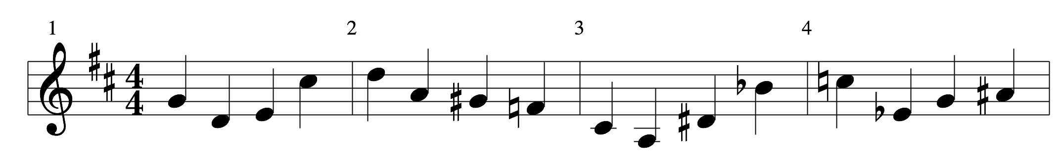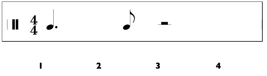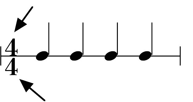 3. Firedelsnote: Denne nóta har ei fylt ovalform med ein stamme. Firedelsnoten varer i eitt slag i 4/4 taktart.
