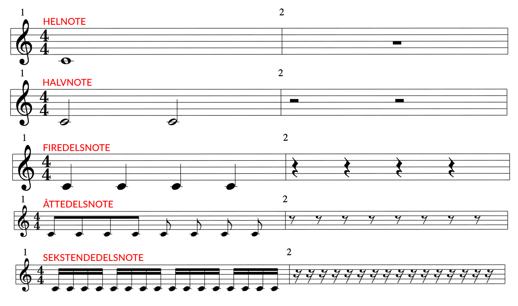 Ein note er representert med ulike symbol, og kvart symbol representerer ein spesifikk noteverdi. I det følgjande er dei vanlegaste noteverdiane forklart: