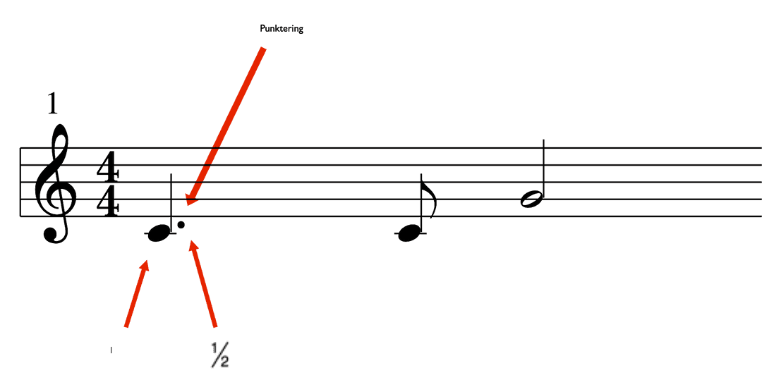 La oss sjå på eit døme: Du har ein firedelsnote, og du vil at han skal vare noko lengre enn ein takt, men kortare enn ein halvnote. Du kan då punktere denne firedelsnoten for å oppnå dette. Vi veit at ein firedelsnote svarer til eitt pulsslag. Så vi legg til halvparten av verdien til firedelsnoten til den opphavelege verdien. Halvparten av ein firedelsnote er ein åttedelsnote. Så når vi legg saman verdien av ein firedelsnote (eitt pulsslag) og ein åttedelsnote (eit halvt pulsslag), får vi ein og ein halv pulsslag totalt.