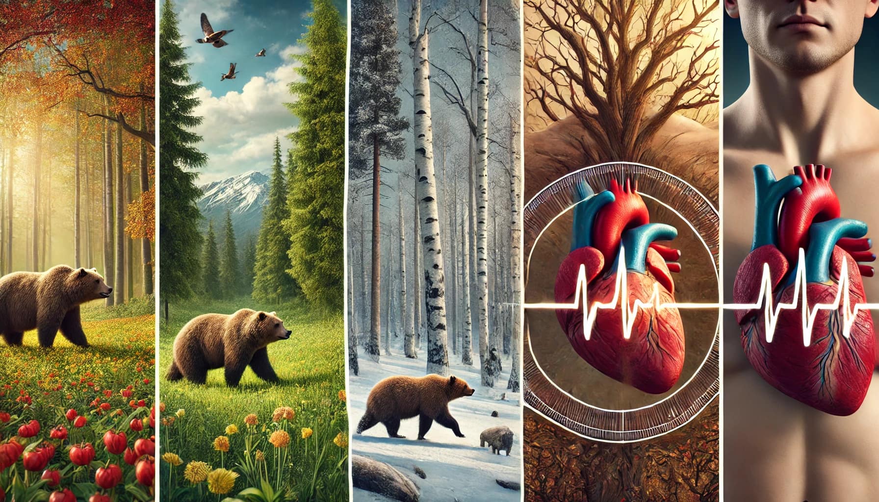 I naturen ser vi rytmen gjennom årstidene som skiftar, og i dyra sin døgnrytme. Sjølv bjørnen i hi er underlagt denne naturlegen rytmen. Mennesket sin biologiske rytme er òg eit døme på dette, og vi er alle kjende med hjarteslaget vårt som slår i sin eigen, unike rytme.