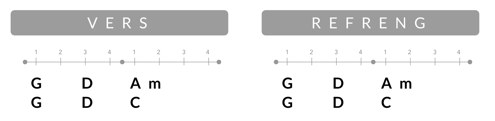 Etter Am-akkorden går du tilbake til G-akkorden, før du går over til D-akkorden igjen. Du avsluttar sekvensen med C-akkorden. Etter at du har spelt C-akkorden, byrjar du igjen på G-akkorden og gjentek heile prosessen.