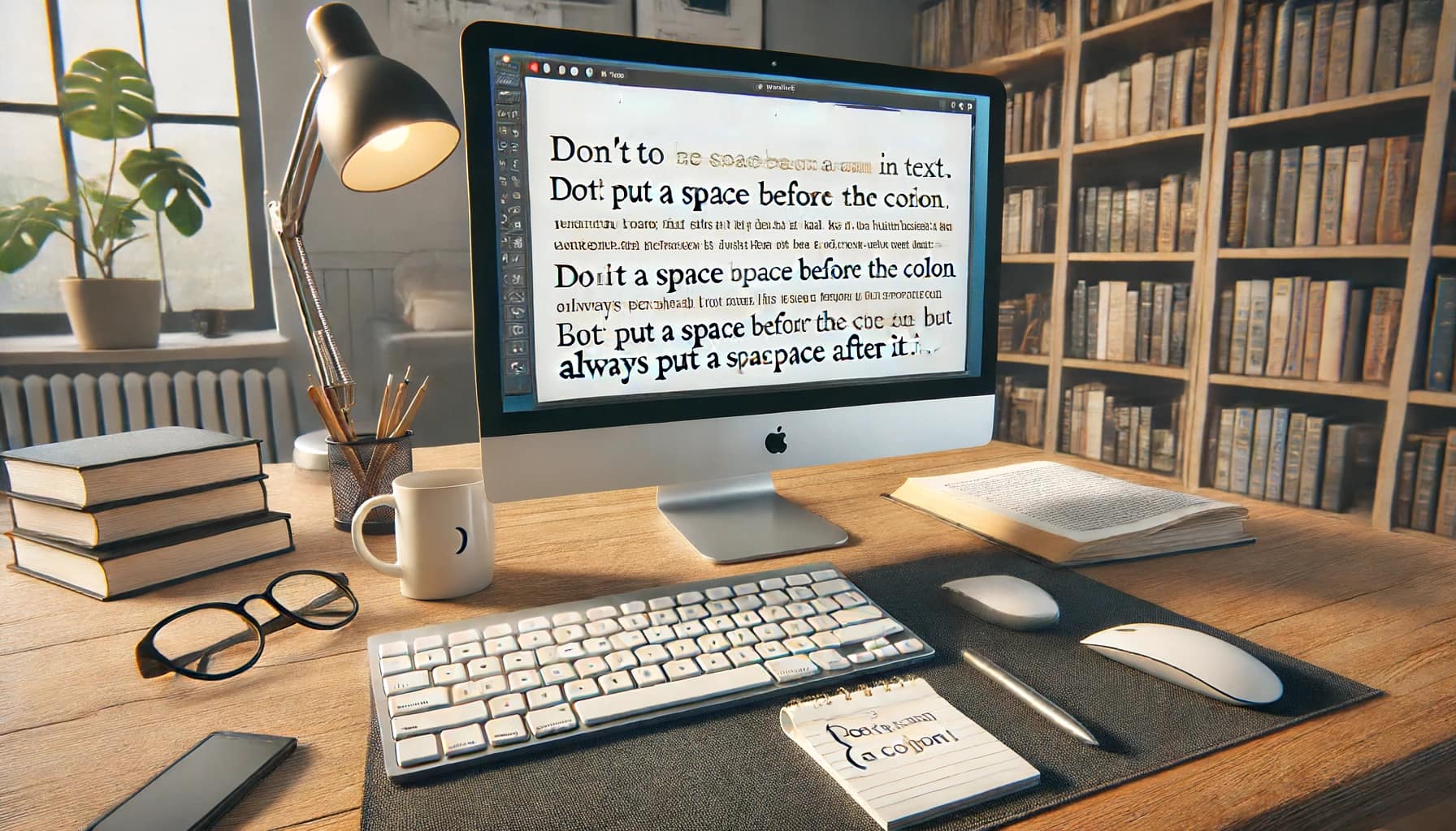 Når ein skriv kolon, er det nokre enkle reglar å følgje: I vanleg tekst skriv ein kolon utan mellomrom framfor. Det betyr at ein skal setje kolon rett etter ordet eller setninga som føregår det, utan å leggje inn eit ekstra mellomrom. Etter kolon skal det derimot vere eit mellomrom. Dette skiljet hjelp med å gjere teksten klarare og lettare å lese. Til dømes: RETT: Han sa: "Eg kjem snart." FEIL: Han sa : "Eg kjem snart."