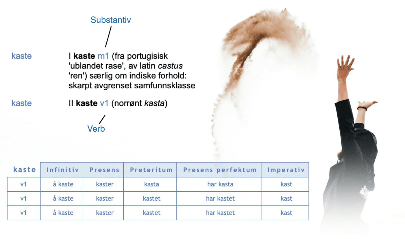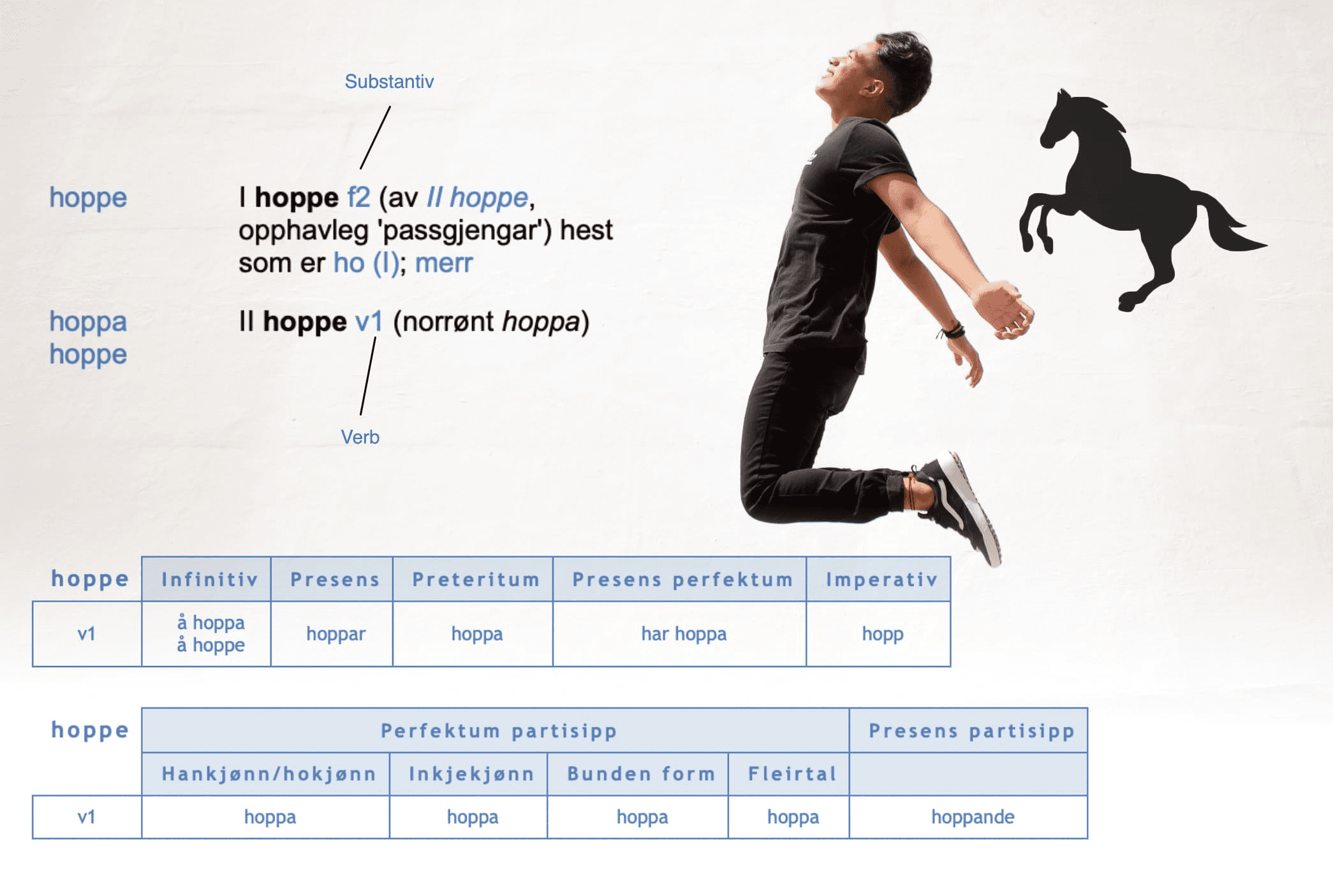 Når ein skal bruke eit verb, er det nyttig å slå opp grunnforma (infinitiven) for å sjå korleis det blir bøygd. Ver merksam på at eit ord kan bety fleire ting, og kan høyre til ulike ordklassar.