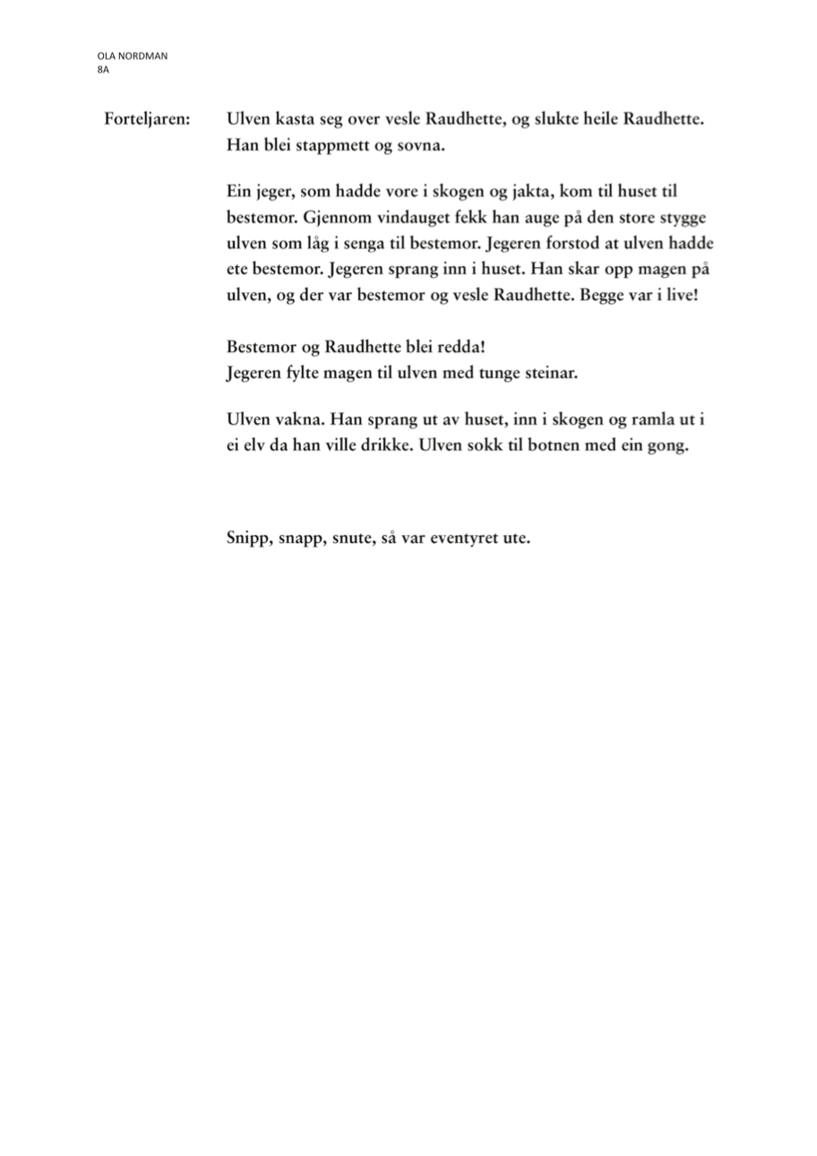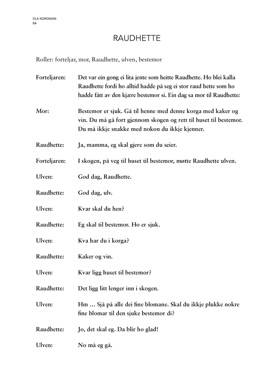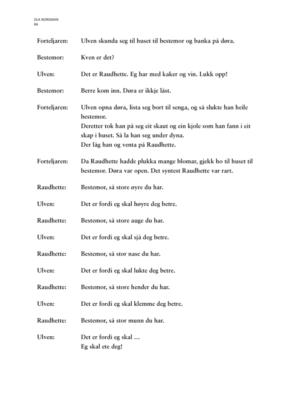 Eit eventyr er som ei magisk dør til ei anna verd. Når du les eller skriv eit eventyr, går du inn i ei rolle og lever deg inn i ei historie. Eit manus er som eit kart over den historia. Verb fortel oss kva som skjer, som 'spring', 'et' eller 'drøymer'. Replikkar er ord personane i eventyret seier. Eit hermeteikn (') viser ofte eigarskap, som 'hunden sin ball'. Ein bindestrek (-) bind saman ord, som i 'eventyr-verda'. Tankestrek (–) er som eit lite pust i teksten. 'Å' og 'og' er ulike. 'Å' blir brukt før verb, 'og' bind saman setningar eller ord. Dobbel konsonant endrar uttale, som 'latter' og 'lèt'. Dette skal du få prøve deg på no!