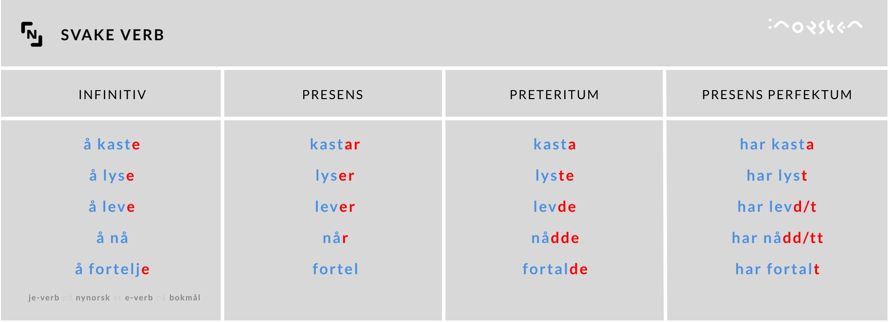 Svake verb har faste endingar i preteritum: -a, -te, -dei, -dde. Til dømes "hoppa", "stupte", "levde", "snudde". Svake verb kan delast inn i fire grupper. A-verb, som "kaste", endar på -a i preteritum ("i går dansa eg"), og på -ar i presens på nynorsk ("no dansar eg"). På bokmål endar a-verb på -a eller -eit i preteritum, og -er i presens.
