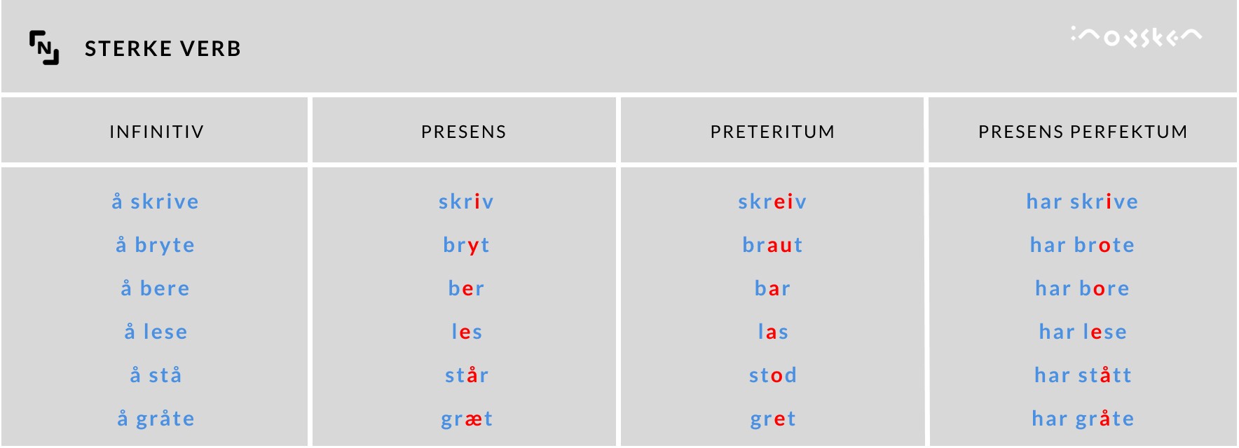 Sterke verb har ikkje eit fast bøyingsmønster slik som svake verb, og dei har ikkje ending i preteritum. Til dømes, "spring" held fram med å vere "spring" i preteritum på nynorsk. Mange sterke verb har vokalskifte, som "å fare" som blir til "fer" i presens, "får" i preteritum, og "har fare" i presens perfektum.