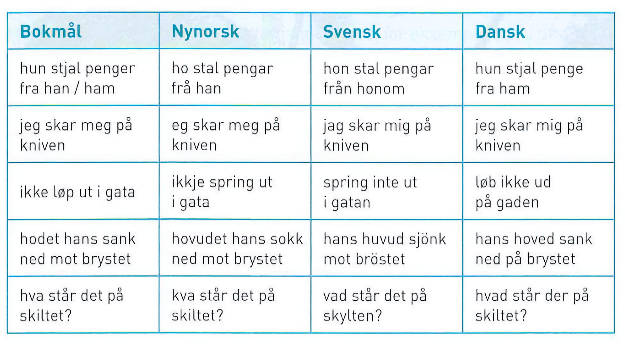 Trass i skilnadene mellom språka er det mykje som bind dei saman. Mange nordmenn forstår svensk godt, og svenske TV-seriar, filmar og bøker blir ofte konsumerte utan behov for omsetjing. Å forstå dansk tale kan vere meir utfordrande, men mange nordmenn les dansk utan store problem. Dette er ein viktig del av den språklege fellesskapen i Norden.