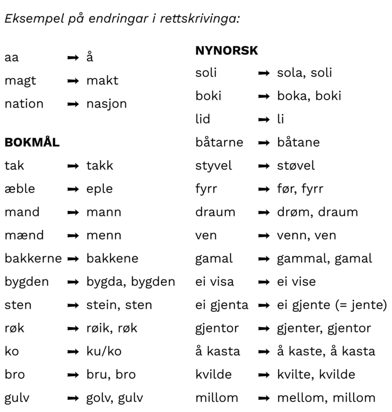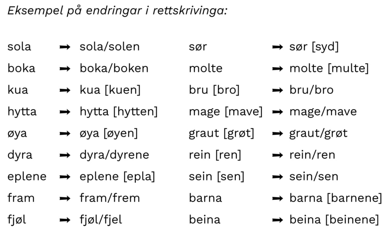 Når vi ser på norsk språk, finst det to hovudmåtar å skrive på: bokmål og nynorsk. Begge er likestilte måtar å skrive norsk på, men dei har nokre skilnader som er viktige å kjenne til. For å forstå korleis ordtilfanget og skrivemåten skil seg mellom bokmål og nynorsk, kan det vere nyttig å sjå på nokre døme og reglar.