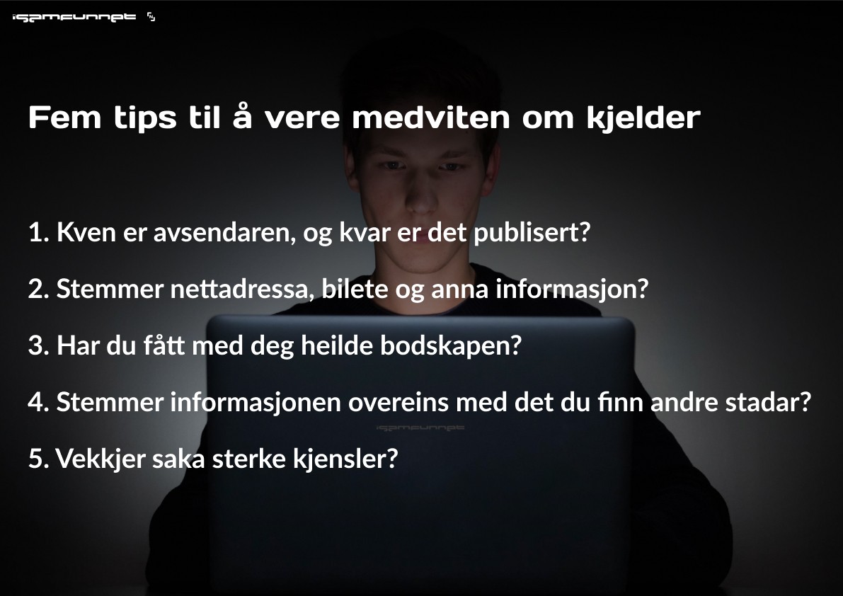 Ein god regel er å alltid tenkje kjeldekritisk, spesielt i sosiale medium. Sjekk fleire kjelder, ver skeptisk, og ikkje ta alt for gitt.