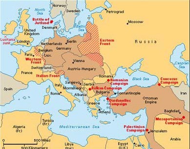 Frontane til krigen var hovudsakleg delte mellom aust og vest. På austfronten kjempa Sentralmaktene mot Russland, medan vestfronten involverte kamp mellom Sentralmaktene og Frankrike, Storbritannia og seinare USA. Vestfronten var prega av skyttargravskrig og stillingskrig, der soldatar levde under ekstreme forhold og opplevde lite framgang.