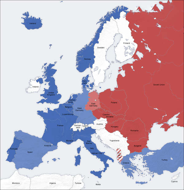 Etter andre verdskrigen var Europa øydelagt og trong hjelp til gjenoppbygging. USA introduserte Marshall-hjelpa, som var økonomisk støtte til dei krigsherja europeiske landa. Sovjetunionen, på si side, nekta å ta imot slik hjelp og hindra også dei austeuropeiske landa i å akseptere den. Dette førte til ytterlegare spenningar og ein deling av Europa, symbolisert ved Winston Churchills berømte uttrykk om eit "jernteppe" som hadde senka seg over kontinentet.