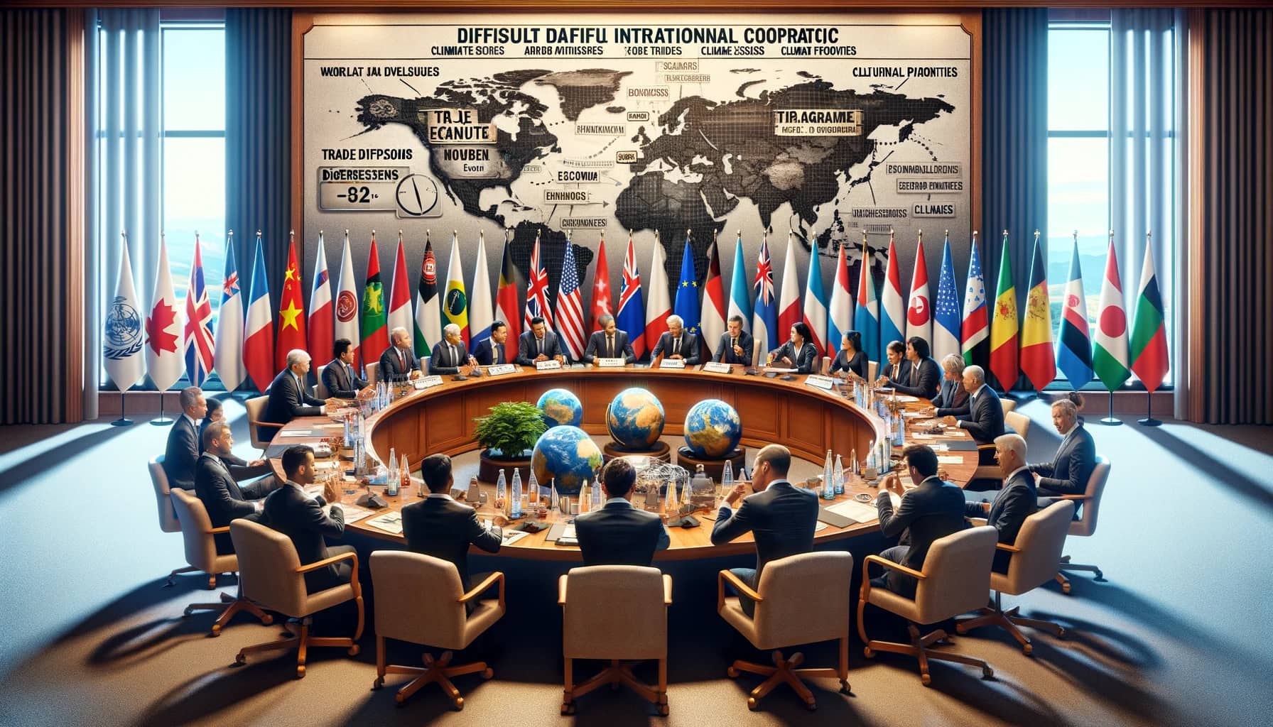 Ein viktig grunn til at internasjonalt samarbeid er utfordrande, er at mange land vel å setje sine eigne interesser først. Dette ser vi tydeleg når det gjeld klimakrisa. For å redusere skadelege utslepp må alle land bidra, men mange vel likevel å sleppe ut klimagassar for å drive fabrikkar eller halde fram med olje- og gassproduksjon. Slik prioritering kan komme av at landa er meir opptatt av kortsiktig økonomisk vinning enn av langsiktige miljømål.