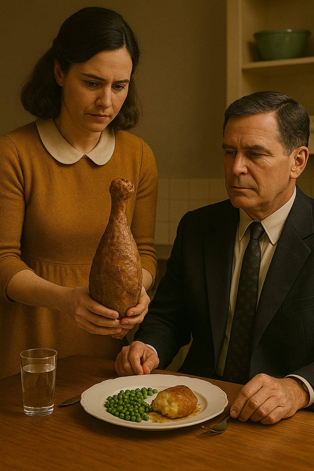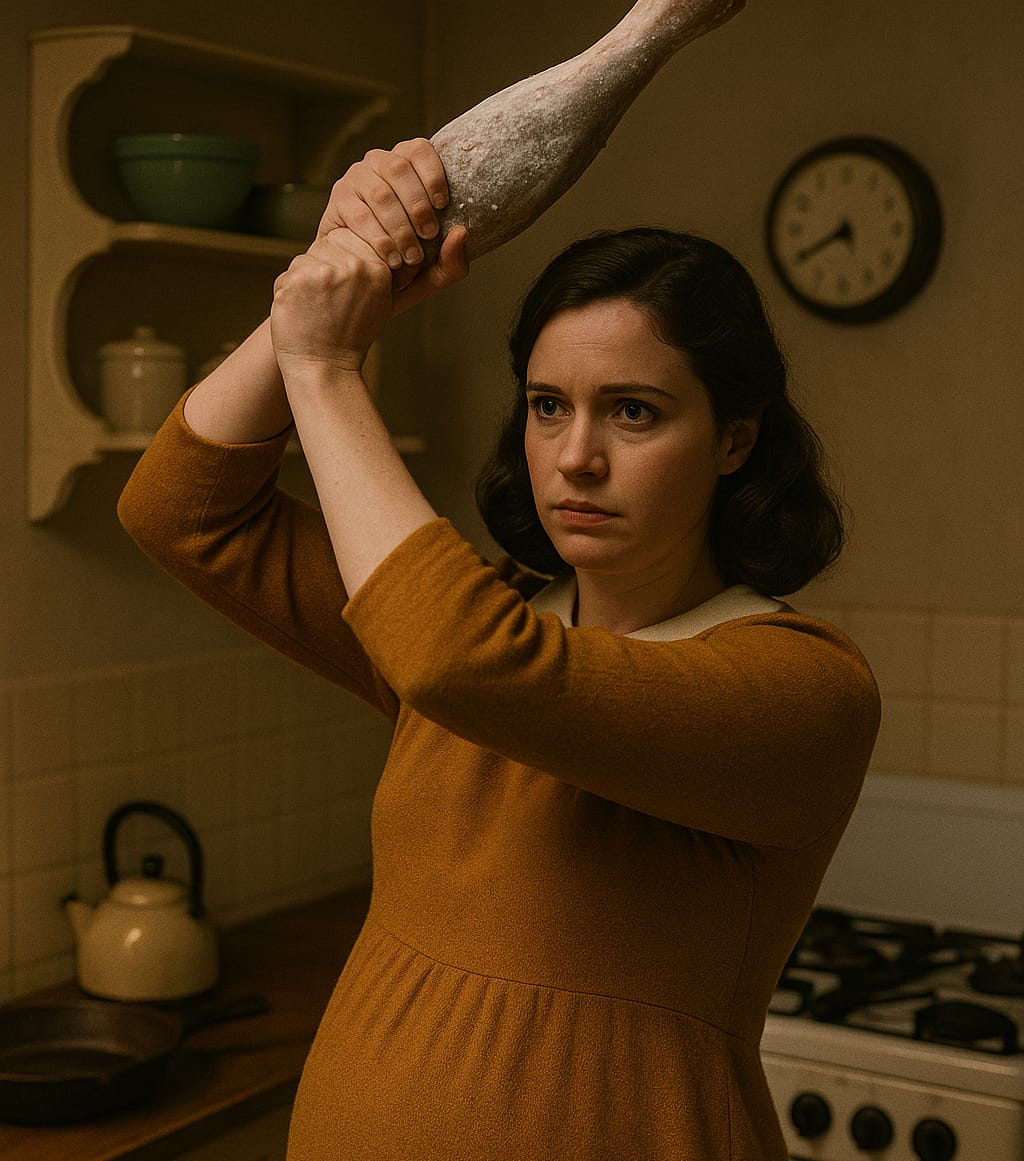 Mary blir handlingslamma, men går til kjøkkenet for å lage middag. Ho tek opp ei frosen lammesteik frå frysen og går tilbake i stova. I eit desperat augeblikk løftar ho kjøtstykket og slår mannen i bakhovudet. Han døyr momentant. Mary innser at ho no har drepe ein politimann, mannen sin, og at ho må finne ein måte å redde seg sjølv og barnet på.